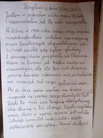 - Los rzucił mnie do Rzeszowa, gdzie wynajmuję pokój u dobrych ludzi - tłumaczy pan Łukasz. - Ojciec właściciela domu, Stefan Iwoński był sołtysem wsi Słocina, która później została przyłączona do Rzeszowa jako dzielnica. Jest w podeszłym wieku, lecz umysł ma bystry i kiedy dowiedział się, że przybyłem z Lubelszczyzny, poprosił mnie o odnalezienie pewnego człowieka. W 1944 roku, we wsi Słocina stacjonował 27 Pułk Piechoty (LWP). Składał się przeważnie z młodych chłopaków, pochodzących z Wileńszczyzny. W 2005 roku do pana Stefana trafił list, którego autor był jednym z żołnierzy tego pułku. Dowiadujemy się z niego, że Antoni Sowul lub Sawul (ciężko odczytać), w podziękowaniu za pomoc jaką otrzymał od ludzi ze wsi, chciałby odwdzięczyć się im jakimś darem. Przez 3 lata wpłacał pieniądze na komitet rodzicielski tamtejszej szkoły, którą nazwano imieniem 27 Pułku Piechoty. Na kopercie wysłanego listu widnieje adres Rozpłucie II, z pocztą w Ludwinie (powiat Łęczyński). Jako, że zbliża się 70. rocznica utworzenia pułku, organizatorom obchodów, zależy na nawiązaniu kontaktu z rodziną Antoniego Sowula/ Sawula. Na razie nie mam możliwości przyjechania do Świdnika i zajęcia się poszukiwaniem tych osób, ale może ktoś z czytelników portalu „Świdnik na kartach historii” zna pana Antoniego lub jego bliskich i mógłby pomóc w skontaktowaniu się z nimi?