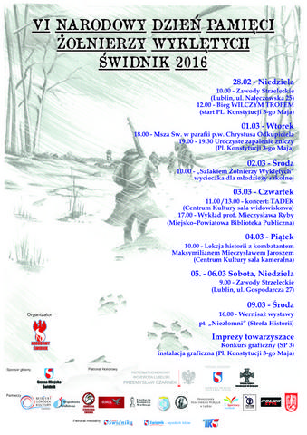 1 marca obchodzony jest Dzień Żołnierzy Wyklętych. Narodowy Dzień Pamięci "Żołnierzy Wyklętych" został ustanowiony przez sejm w 2011 r. Mówiąc o "Żołnierzach Wyklętych" mamy na myśli uczestników polskiego podziemia niepodległościowego, walczących po 1944 roku z reżimem komunistycznym, zrzeszonych w różnych organizacjach, na przykład Armii Krajowej czy Narodowych Siłach Zbrojnych. Pierwszy dzień marca jest dniem szczególnie symbolicznym dla żołnierzy antykomunistycznego podziemia. Tego dnia, w 1951 roku, wykonany został wyrok śmierci na kierownictwie IV Komendy Zrzeszenia „Wolność i Niezawisłość”. Oto program świdnickich obchodów: