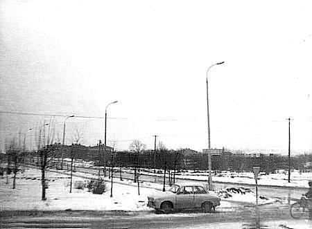 Widok na przyszłe wieżowce przy ulicy Jarzębinowej 1, 3, i 5 na os. Brzeziny. Syrenka stoi na uliczce wyjazdowej z osiedla przy bloku Racławicka 19. Zdjęcie z ok. 1980 roku.