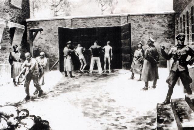 Egzekucja pod Ścianą Straceń, obraz byłego więźnia Wł. Siwka - z Archiwum Państwowego Muzeum Auschwitz-Birkenau w Oświęcimiu